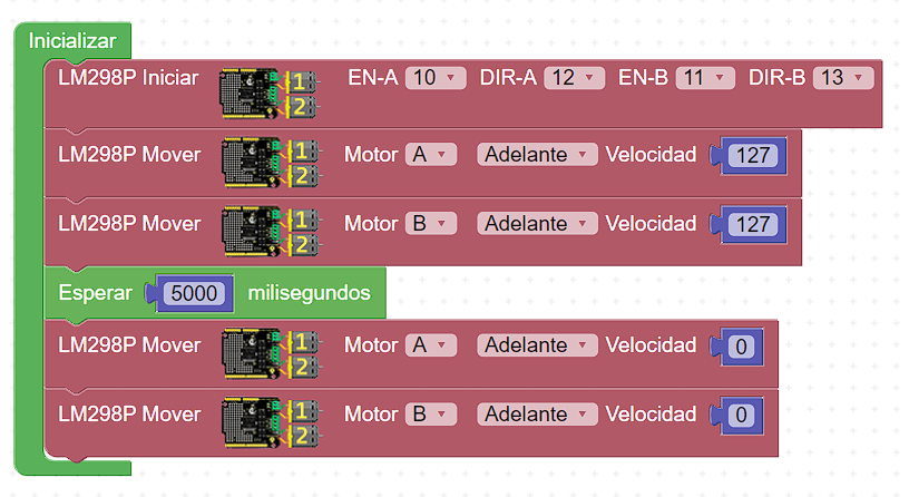 - En Motor seleccionamos el motor a controlar y su respectivo giro (adelante o atrás)