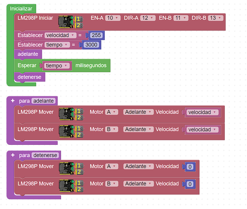🧠 Las funciones nos ayudan a reutilizar código de una manera más organizada y óptima, en el siguiente ejemplo veremos como programar nuestros motores con una función para que el mismo se mueva hacia adelante durante 3 segundos y después se detenga.