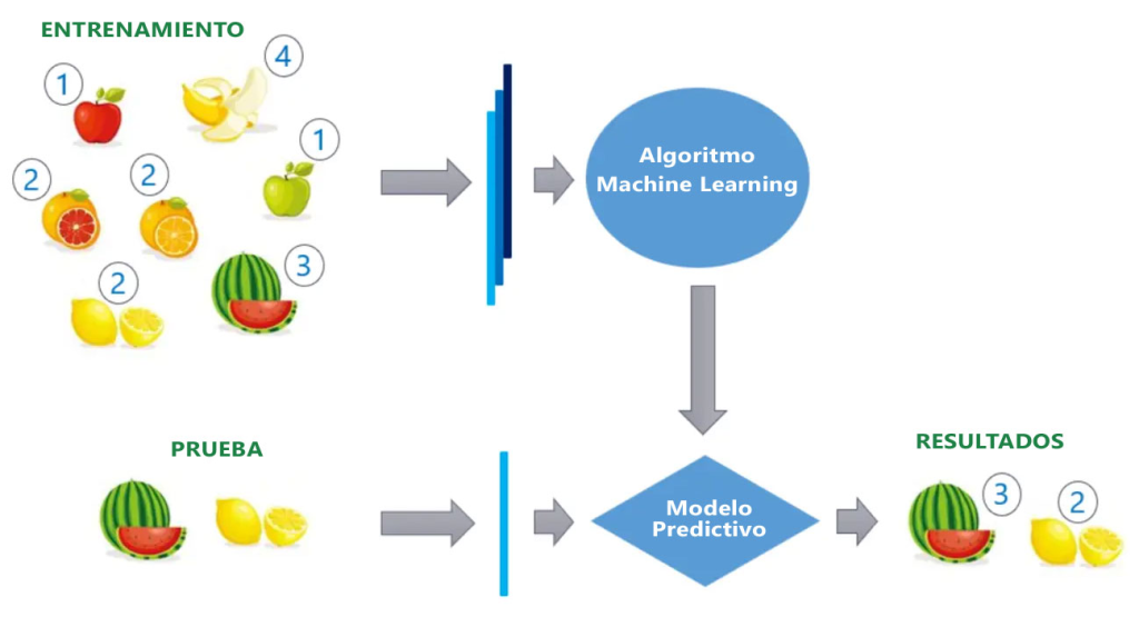 🧠 Le damos al algoritmo una serie de ejemplos para «enseñarle» a reconocer patrones o características. En nuestro ejemplo lo entrenamos con varios tipos de frutas, diciéndole que valor tiene cada una en números y luego nos identificará la fruta según el modelo predictivo que se ha creado.