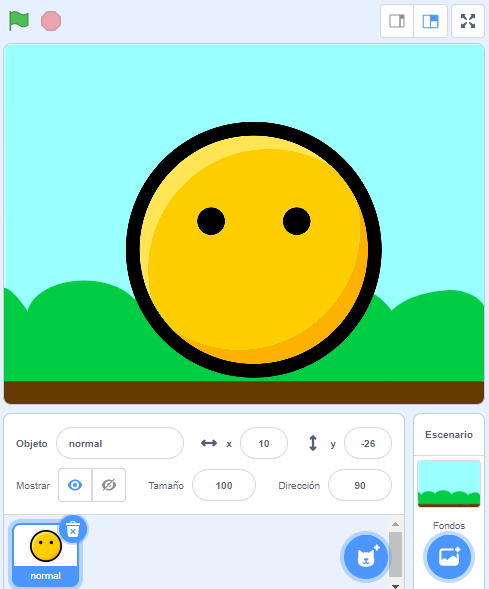 💡 Añadimos las imagen normal.png en un nuevo Sprite (las demás imágenes de feliz.png y triste.png deben importarse al disfraz del sprite normal.png). Para buscar la imagen del escenario debes escribir: blue sky.