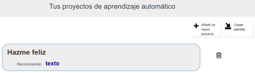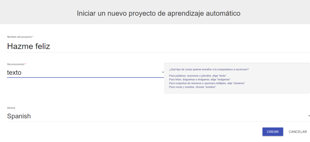 🆘 Darle un nombre al proyecto (Hazme feliz), escoger el tipo de reconocimiento (texto) e indicar el idioma del reconocimiento de texto (Spanish)