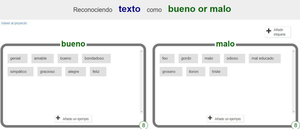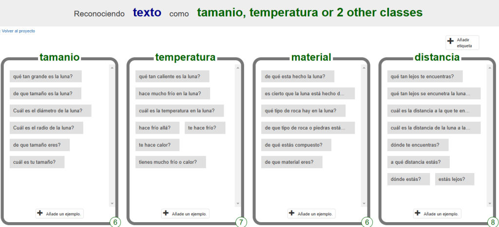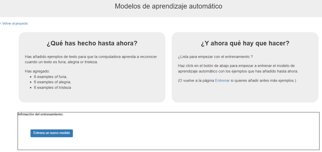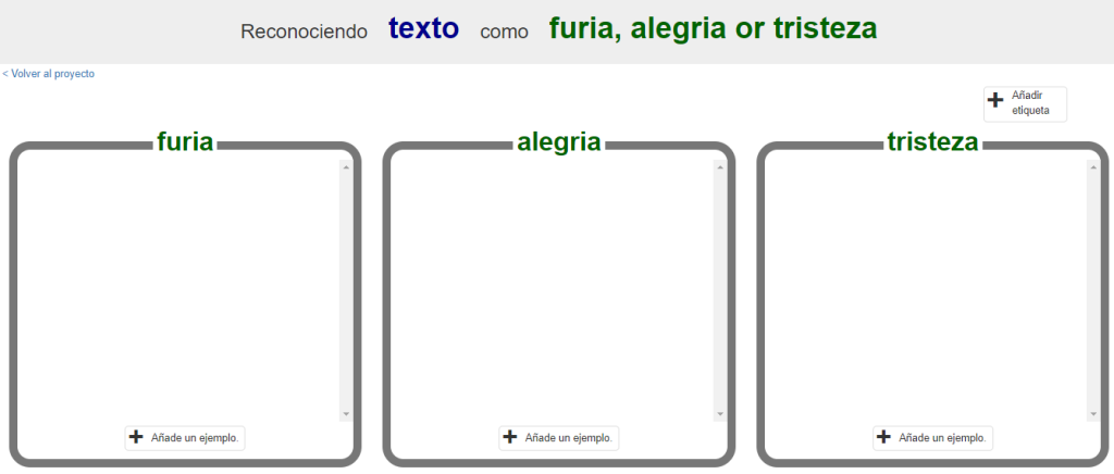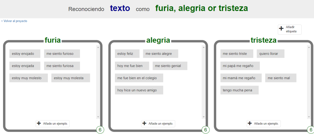 🆘 Añade los datos de entrenamiento en cada etiqueta (Escribe ejemplos de cómo alguien le diría como se siente en cada etiqueta) y después clic en volver al proyecto
