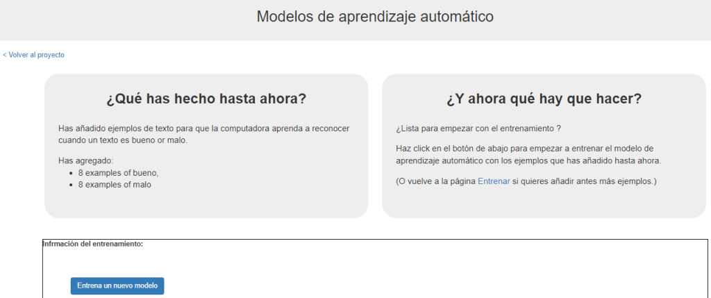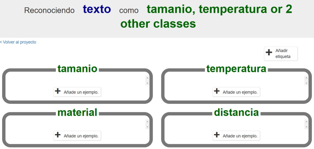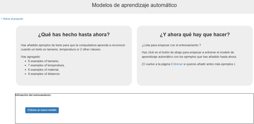 🆘 Añade los datos de entrenamiento en cada etiqueta (recuerda que mientras más datos tengas mucho mejor) y después clic en volver al proyecto