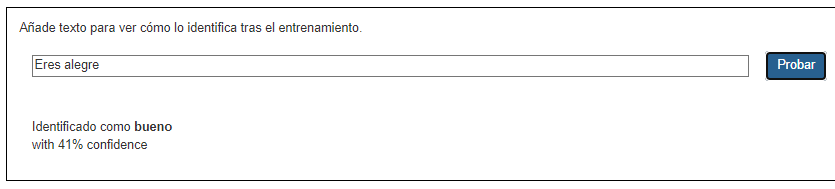 🆘 Podemos probar la IA escribiendo un mensaje y haciendo clic en el botón Probar, la IA nos dirá que los que escribimos es algo bueno (halago) o es algo malo (insulto). Después hacemos clic en volver al proyecto (parte superior)