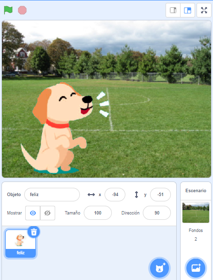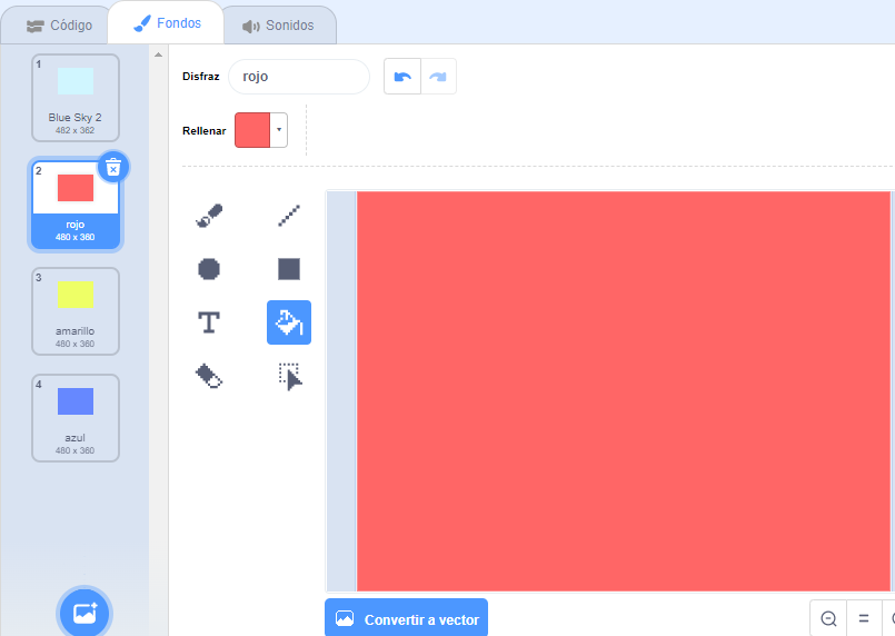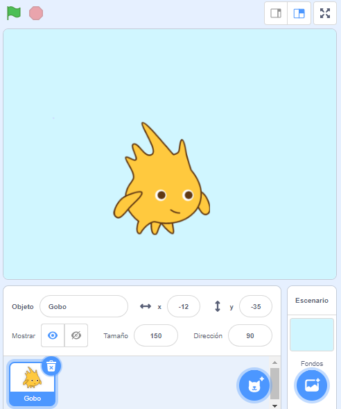 🆘 Pista: Para buscar al personaje debes escribir: gobo y cambiar su tamaño a 150, para buscar el fondo debes escribir: blue sky y aparte de ello debes dibujar tres fondos con los colores rojo, amarillo y azul.
