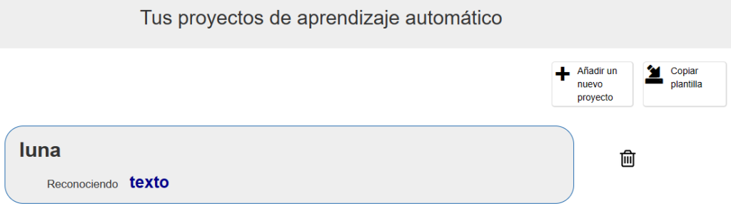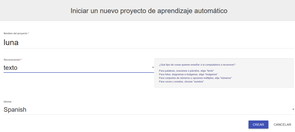 🆘 Darle un nombre al proyecto (luna), escoger el tipo de reconocimiento (texto) e indicar el idioma del reconocimiento de texto (Spanish)
