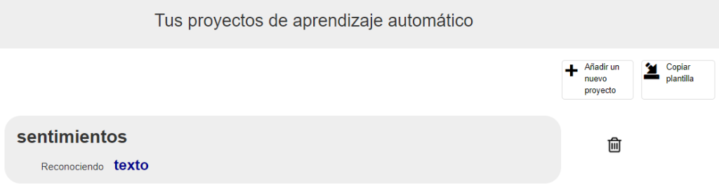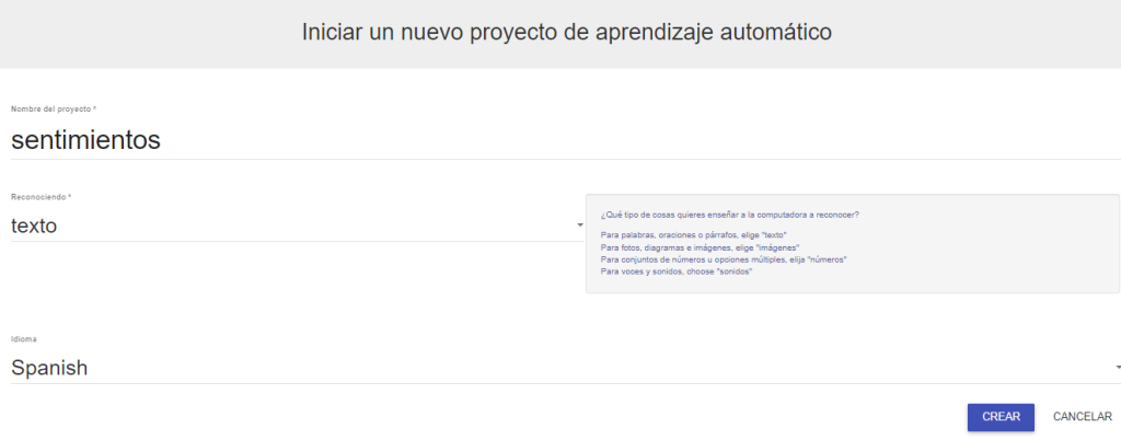 🆘 Darle un nombre al proyecto (sentimientos), escoger el tipo de reconocimiento (texto) e indicar el idioma del reconocimiento de texto (Spanish)