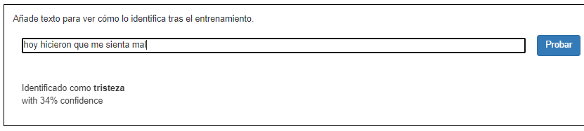🆘 Podemos probar la IA escribiendo un mensaje y haciendo clic en el botón Probar, la IA nos dirá que los que escribimos pertenece a alguna de las categorías o etiquetas que pusimos en el entrenamiento. Hacemos clic en el enlace superior Volver al proyecto