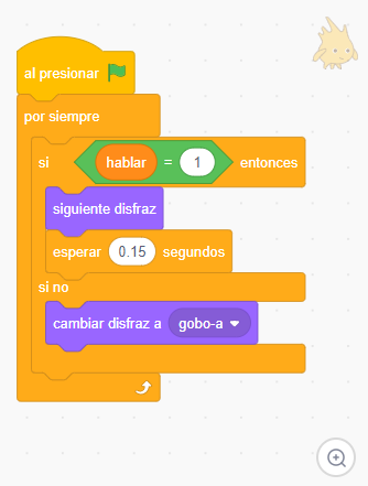 ➡️ Código para crear la animación de Gobo dependiendo del valor de la variable hablar (0 = callado, 1 = mover la boca)