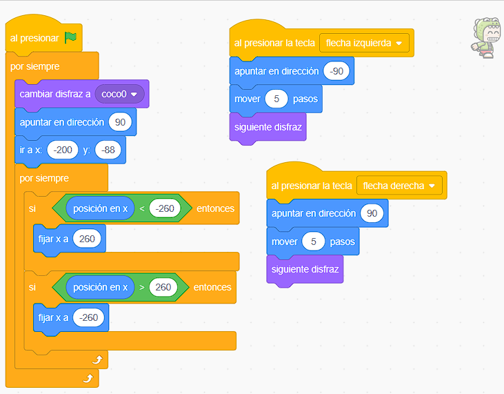 🆘 Pista: Solo reemplaza el evento de «al presionar la tecla derecha» por «al presionar la tecla d» para que tu Sprite se mueva a la derecha y de forma similar reemplaza «al presionar la tecla izquierda» por «al presionar la tecla a» para que tu Sprite se mueva a la izquierda.