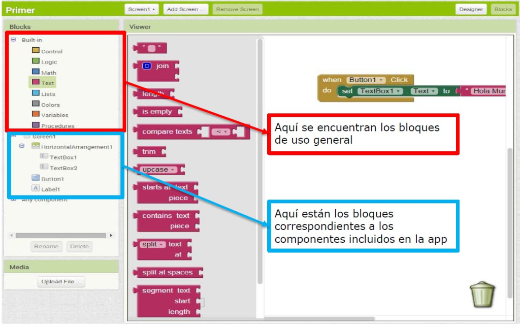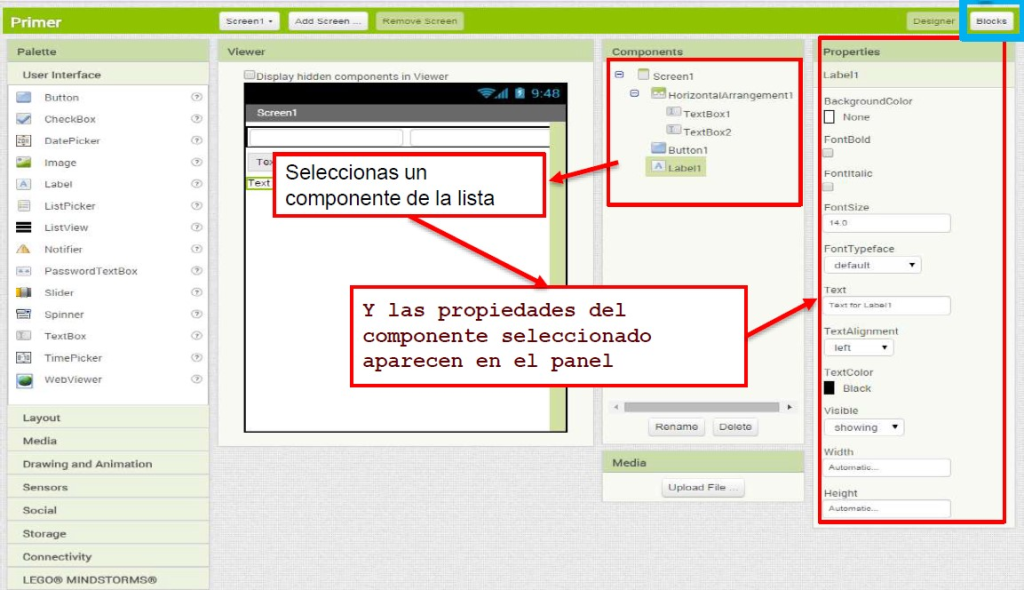 🧠 El comportamiento o funcionamiento de nuestra aplicación se programa mediante bloques en el editor de bloques