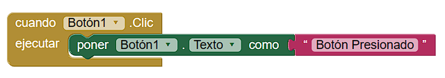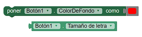 Cada componente tiene su propio conjunto de propiedades que describen sus características. Así el componente Botón tiene propiedades como, por ejemplo, Color de fondo. Algunas de estas propiedades se pueden configurar inicialmente desde el Diseñador. En otras ocasiones se pueden modificar en tiempo de ejecución mediante el correspondiente bloque. Los bloques de propiedades son de color VERDE y permiten leer el valor de una propiedad del componente (verde claro) o bien establecer el valor de esa propiedad (verde oscuro).