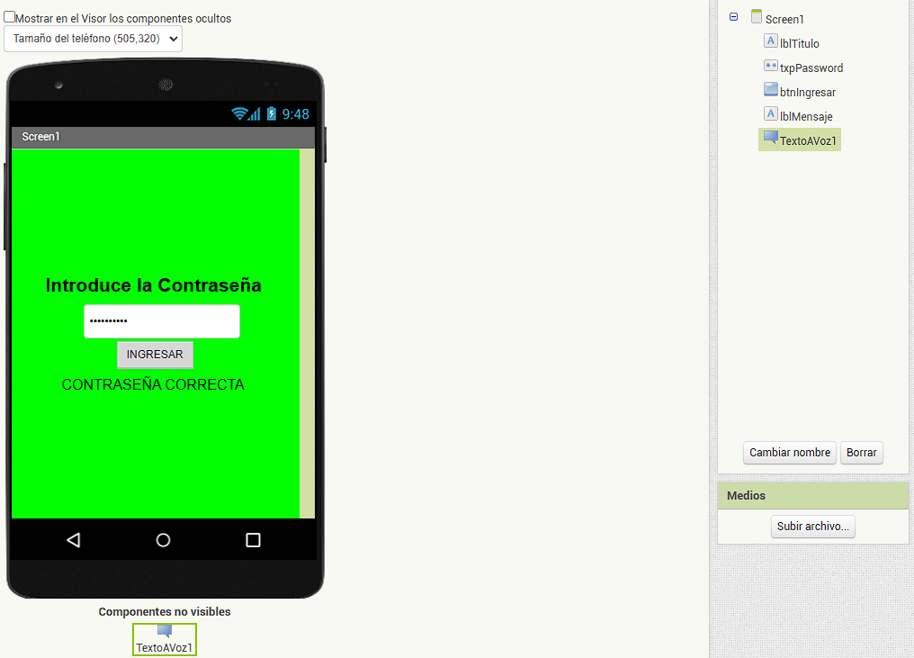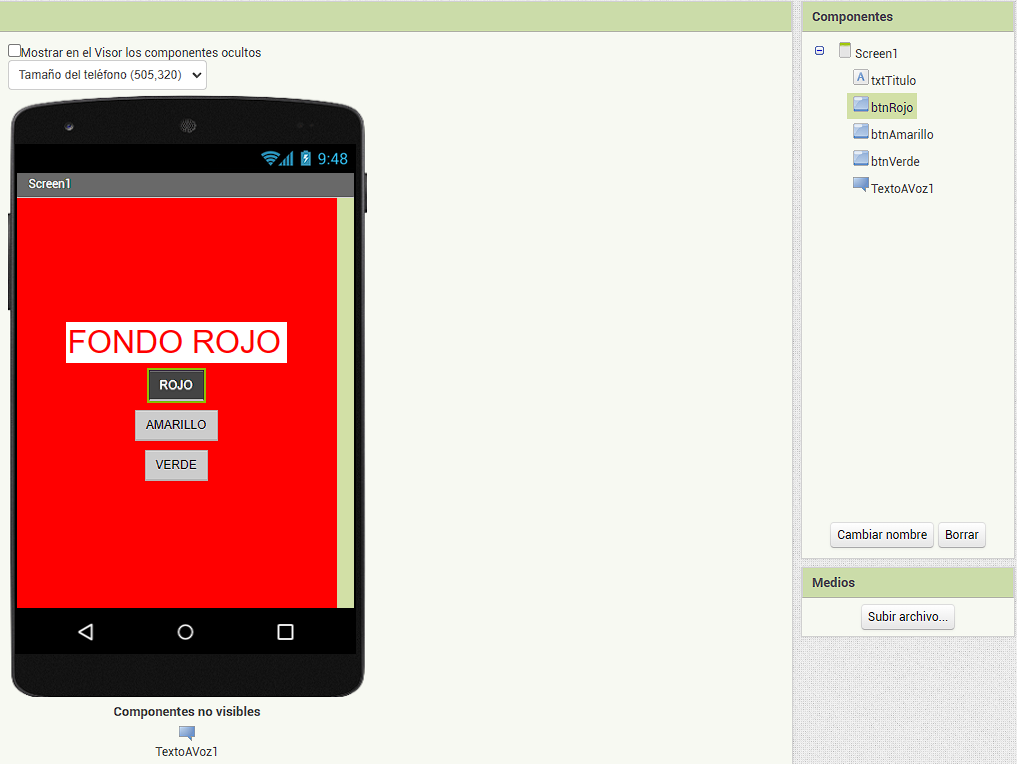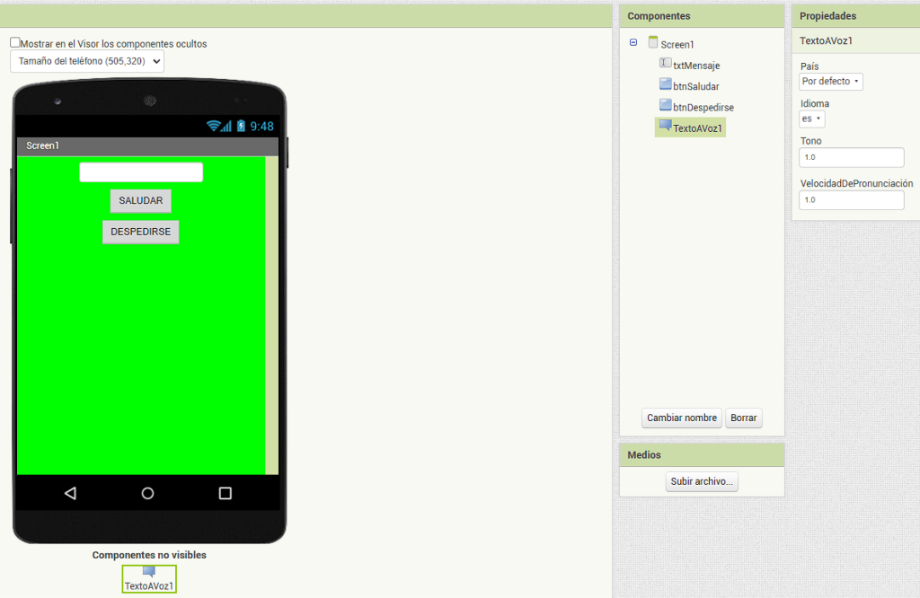 ⚠️ Recuerda seleccionar el elemento TextoAVoz y configurar el idioma en español (es)