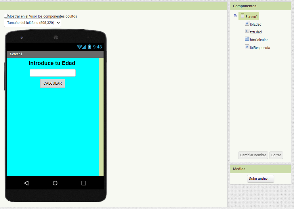 ⚠️ Recuerda que la propiedad SóloNúmeros del componente txtEdad debe estar activada y que la etiqueta lblRespuesta debe tener su propiedad texto en blanco (nada escrito)