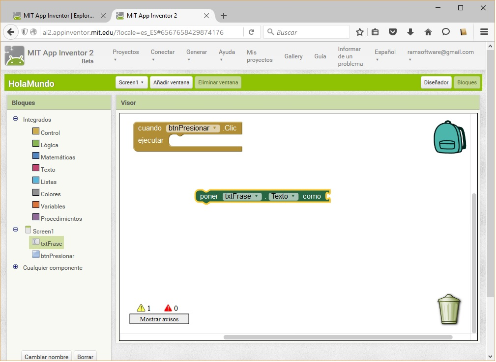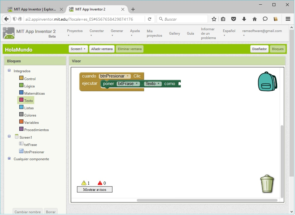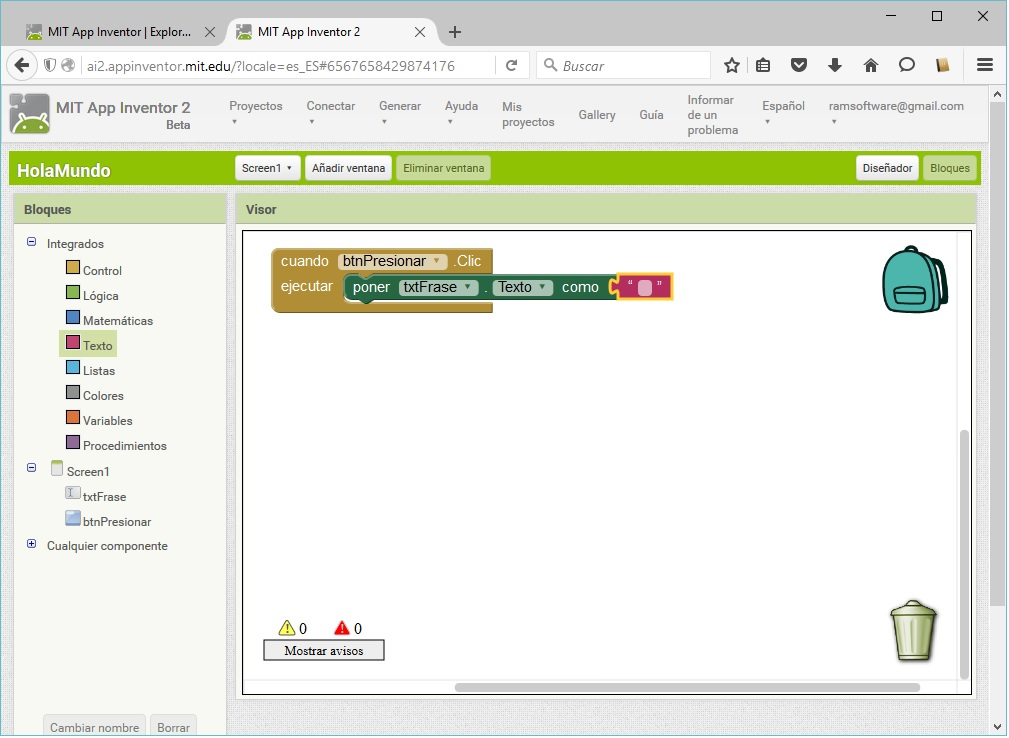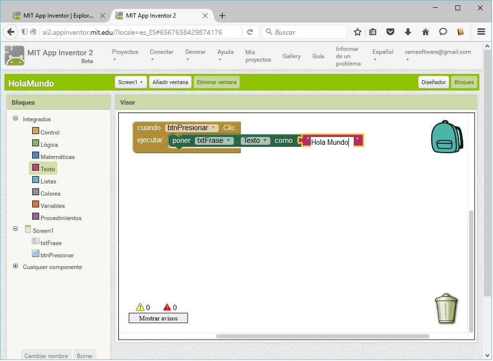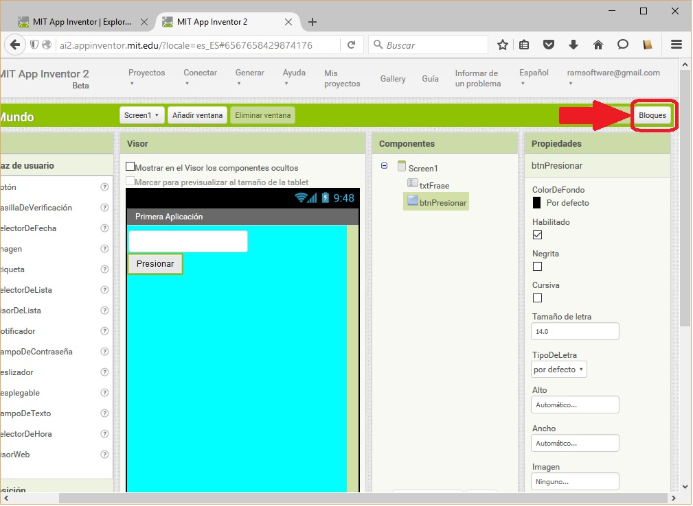 💡 Es momento de programar: El objetivo es que al presionar el botón, aparezca el texto “Hola Mundo” en el Campo de Texto. Para ir al editor de bloques se debe presionar el botón “Bloques”