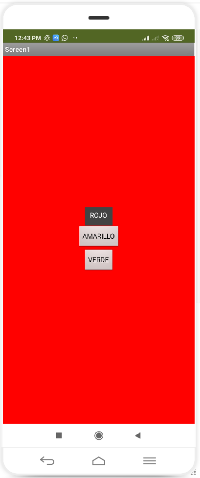 💡 Utiliza la información del ejercicio anterior para añadir más características, la aplicación debe ser capaz de «Hablar» y decirnos que botón ha sido presionado para el cambio de color de fondo. De igual manera debe tener una etiqueta en la parte superior (en el ejemplo la etiqueta tiene un tamaño de 36 con un color de fondo blanco y un color de texto rojo) que también mostrará el color al que debió cambiar el fondo.