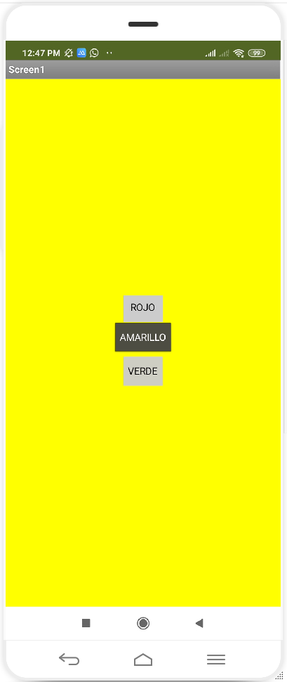 💡 Utiliza la información del Ejercicio N° 2: «Añadiendo Voz y Manejando más Eventos» para elaborar una aplicación que tenga 3 botones y que al presionar un determinado botón cambie el color de fondo por el nombre del botón correspondiente, a la vez el botón que ha sido presionado debe cambiar a un color diferente (en el ejemplo está gris oscuro con letras blancas) y volver a su color original cuando otro botón sea presionado.