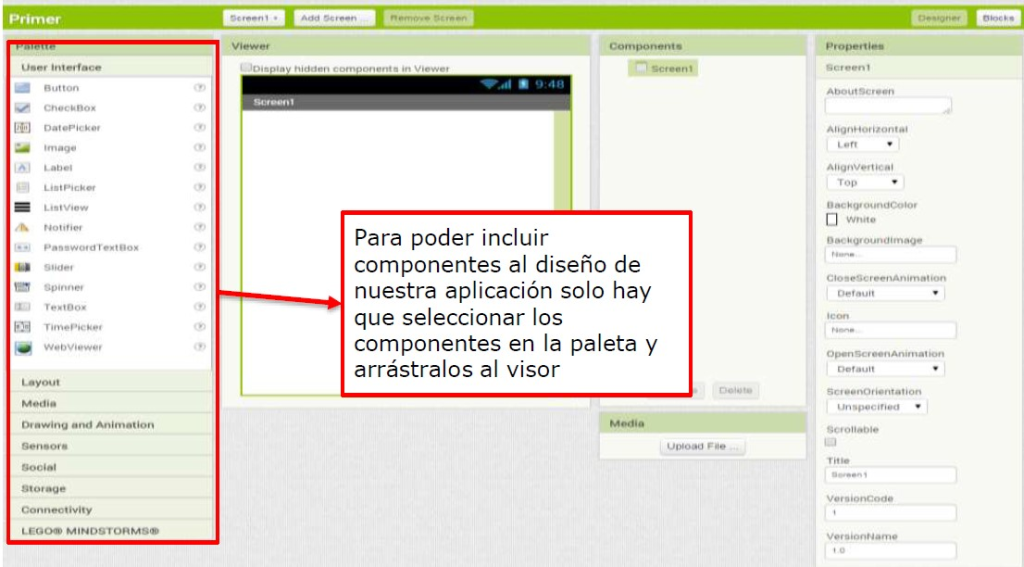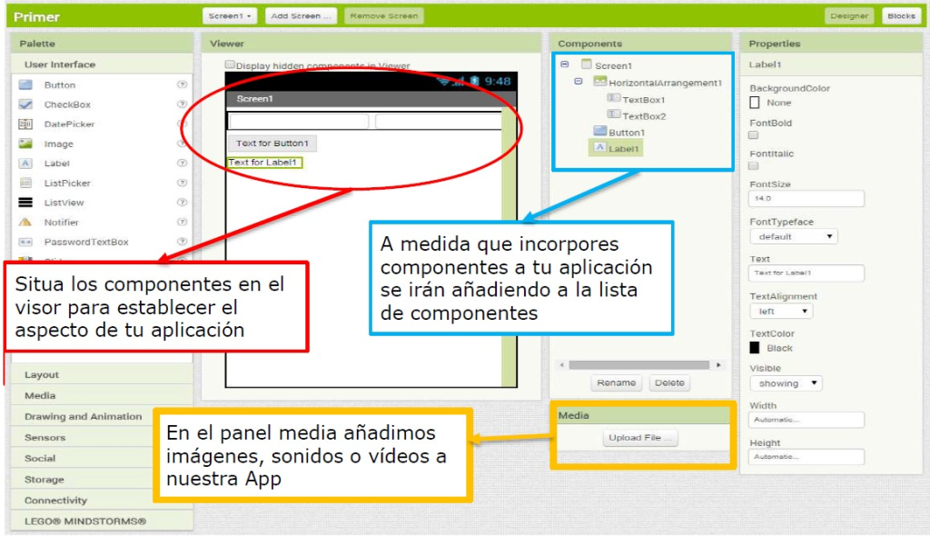 🧠 La herramienta de diseño nos permite seleccionar los componentes de la App y definir el interfaz de usuario de la misma (botones, cuadros de texto, etiquetas, etc.)