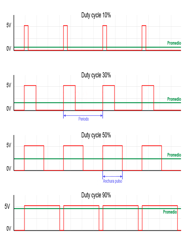 💡 La modulación por ancho de pulsos (también conocida como PWM, siglas en inglés de pulse width modulation) de una señal o fuente de energía es una técnica en la que se modifica una señal eléctrica para controlar la cantidad de energía que se envía a una carga.