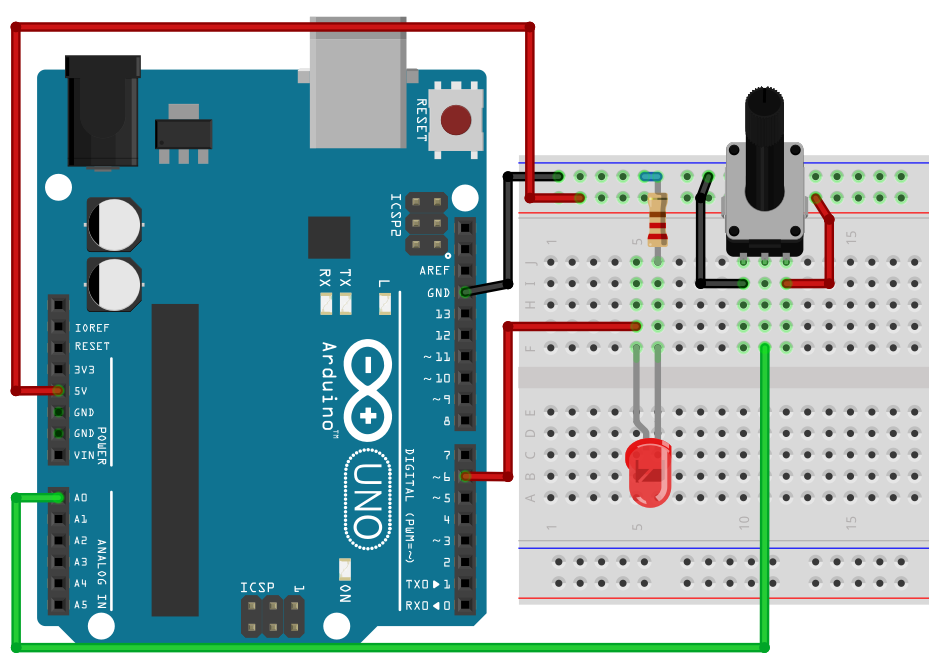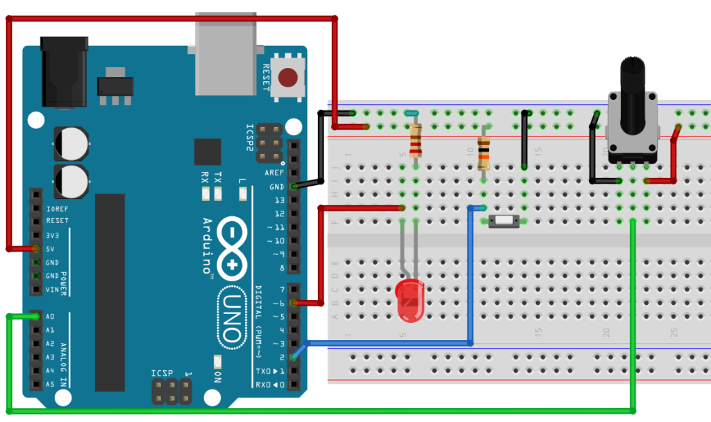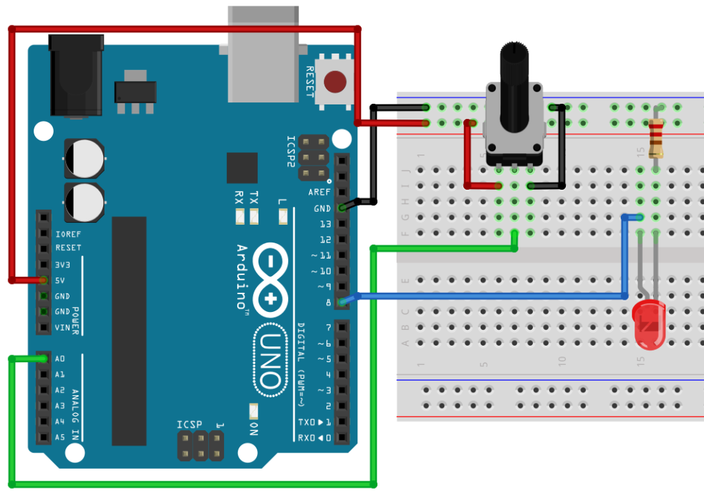 🧠 Controlar el brillo de un LED para encenderse de manera proporcional hasta alcanzar su brillo máximo al girar un Potenciómetro. Tu tarea es realizar el programa que al leer una entrada análoga de un potenciómetro (0 – 1023) se ajuste el valor de PWM (0 – 255) de un LED, recuerda mapear el valor del potenciómetro..