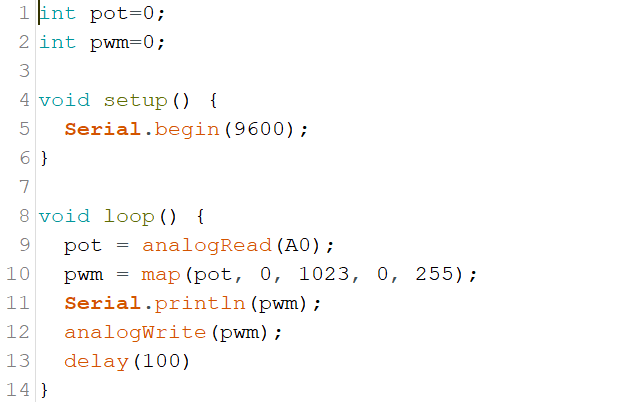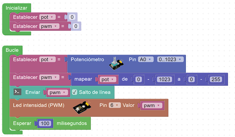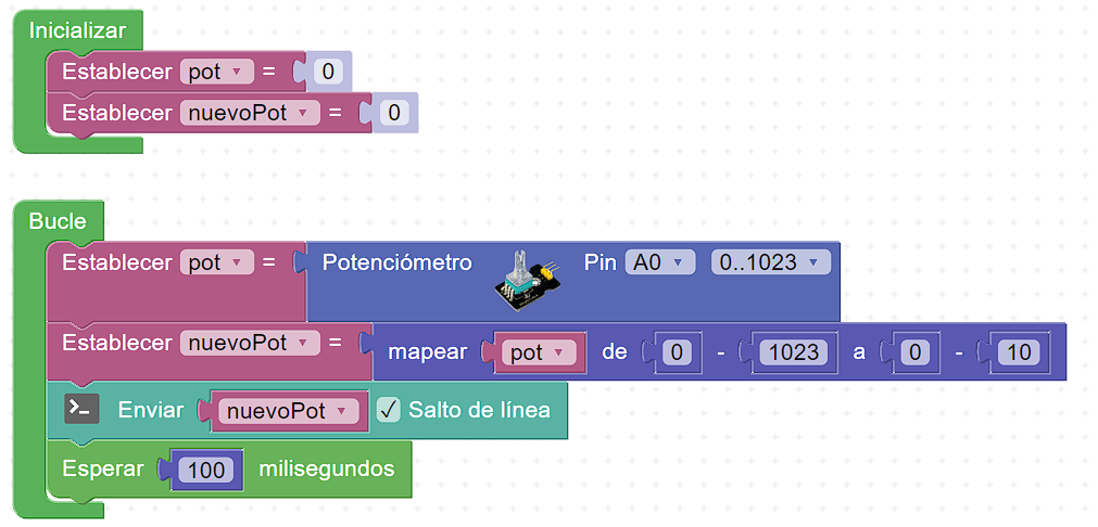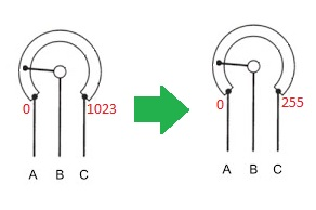 🧠 Como sabemos la entrada de datos de un Potenciómetro (sensor analógico) tiene un rango de valores que va de 0 a 1023, en éste ejemplo queremos visualizar un nuevo rango de valores que vaya de 0 a 255.