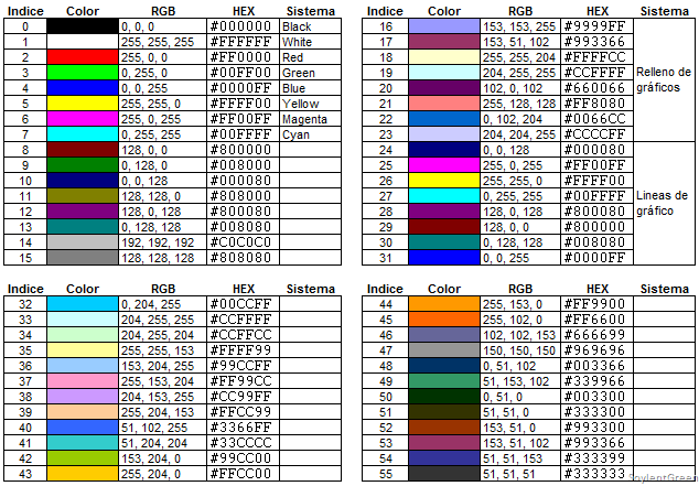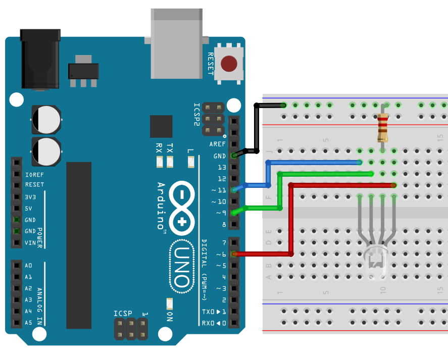 Para combinar los colores se hace uso de PWM para variar el voltaje en los pines del LED RGB, como guía se utiliza una tabla con valores analógicos de salida que deben ser programados en el Arduino.
