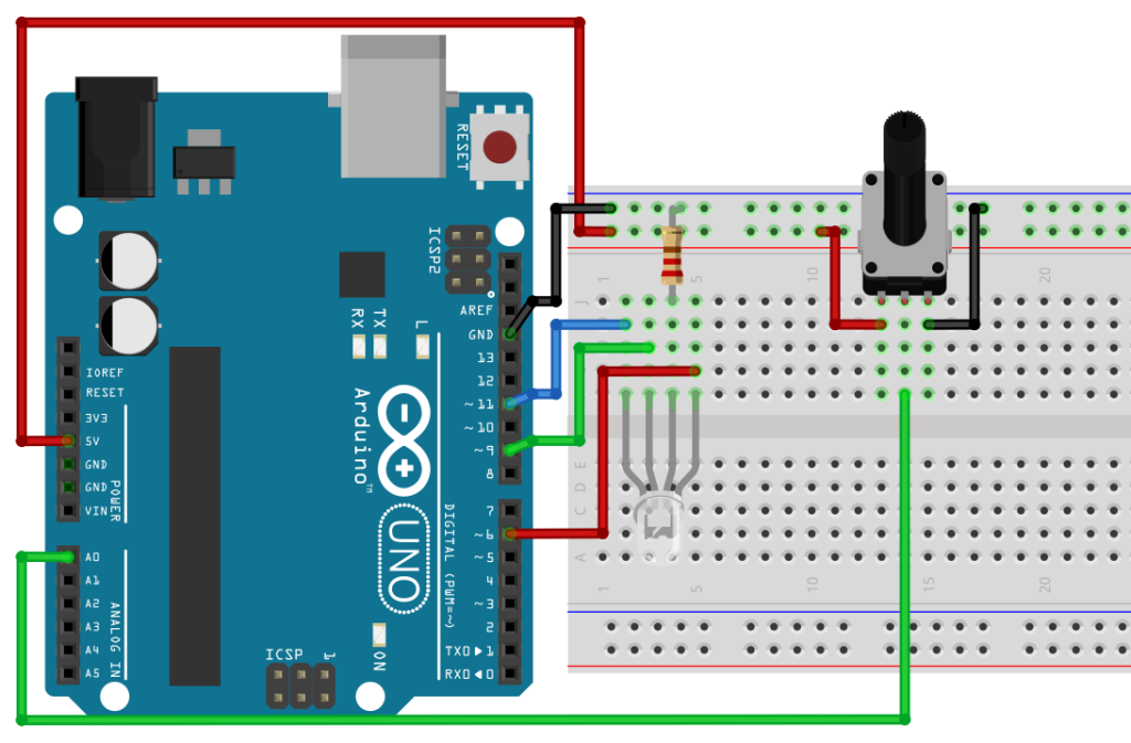 🧠 Utiliza la información del ejercicio «Programando Colores» para que con la ayuda de un Potenciómetro que de lecturas del 1 al 3 (mapear) que se vean por comunicación serial, el LED RGB pueda cambiar de color cuando al girar el Potenciómetro marque: