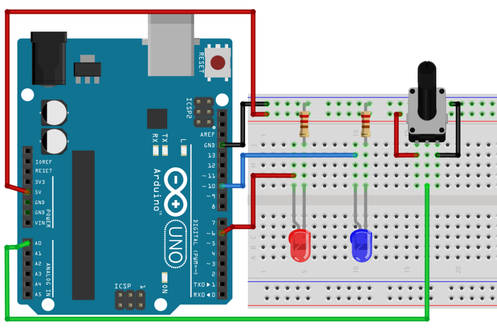 🧠 Utiliza la información del ejercicio «Variando el Brillo de un LED» para que controle la intensidad de luz de dos LEDs de manera inversa, eso quiere decir que mientras gire el Potenciómetro en un sentido, un LED debe aumentar su brillo y el otro debe disminuir su brillo. Mientras que al girar en sentido contrario la intensidad de luz de ambos LEDs debe invertirse.