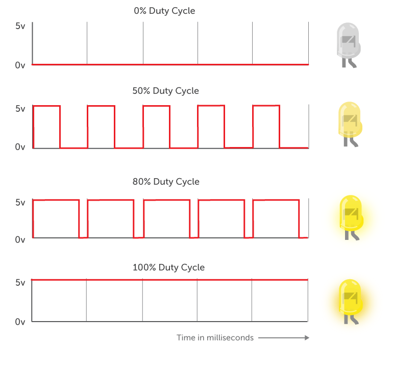 🧠 Por ejemplo si le aplicamos PWM a un LED podemos variar su intensidad de brillo y si le aplicamos un PWM a un motor DC logramos variar la velocidad del mismo con la característica de mantener su par (fuerza) constante.
