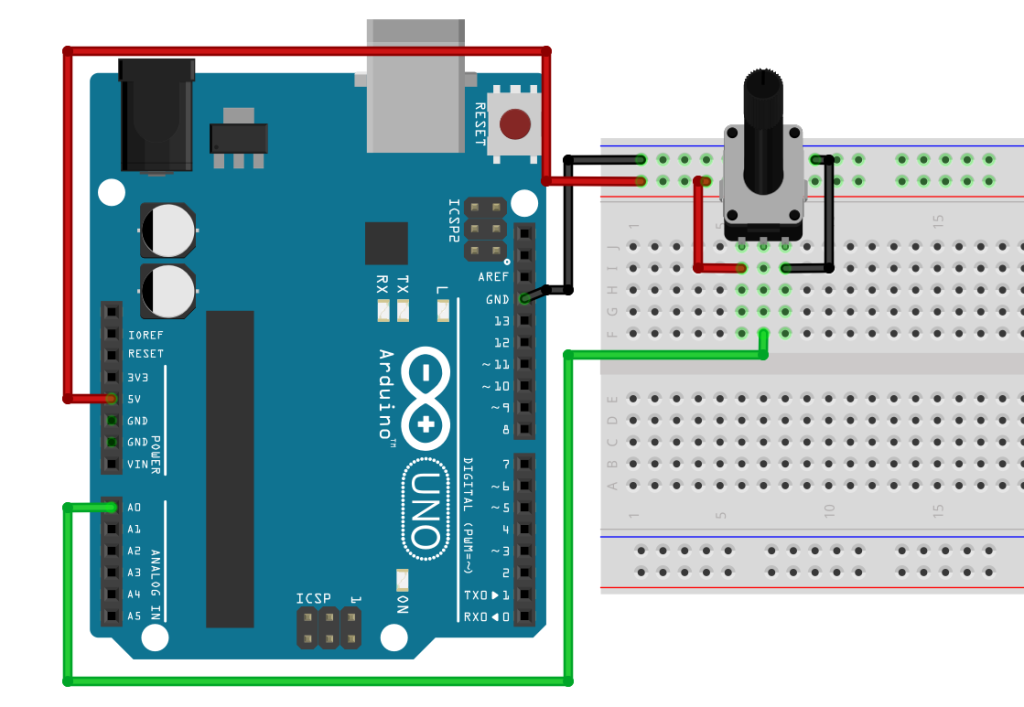 💡 Se debe utilizar un Potenciómetro para simular el sensor de temperatura, en este caso con el potenciómetro tendremos «valores de temperatura» que vayan de 0 a 1023 °C.